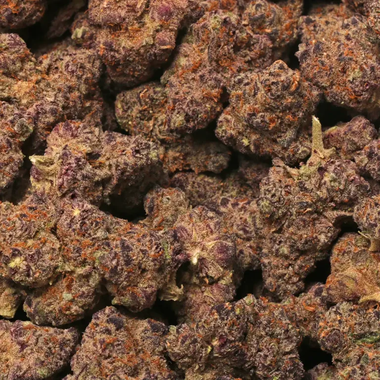Dense green buds dusted in frosty trichomes are accented by deep purple hues and fiery orange pistils, creating a visually striking cannabis experience.